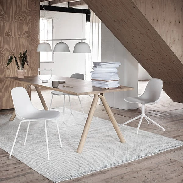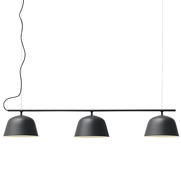 Le luminaire Ambit Rail de Muuto est la nouvelle version des lampes de billard classiques de TAF Studio. Le design minimaliste se compose d’une rangée de trois abat-jour simples, déjà présents dans la suspension Ambit, et d’un rail métallique horizontal suspendu par deux fils d’acier. La finesse des fils crée l’illusion amusante d’une lampe flottante et l’intérieur blanc des abat-jour en aluminium filé reflète la lumière de manière agréable. La suspension Ambit Rail constitue un excellent choix au-dessus d’un îlot de cuisine, d’une table à manger et d’une table de réunion.